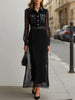 Maeyira presents the Black Sheer Maxi Dress with Gold Buttons - Long Sleeve Collar—an elegant piece that seamlessly blends classic tailoring with flowing sophistication. The luxurious black chiffon features delicate pleating that creates beautiful fluid movement, while the crisp shirt collar, gold button-down front, and long sleeves with refined cuffs add polished structure to the graceful maxi-length silhouette.