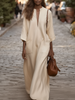 Maeyira presents the Cream Linen Maxi Dress with Pockets - 3/4 Sleeve V-Neck Oversized—an effortlessly chic piece that embodies laid-back sophistication with timeless appeal. The soft, breathable cotton fabric creates a relaxed oversized silhouette with gentle drape, while the minimalist V-neckline and 3/4 sleeves offer modern, easy elegance. Functional deep side pockets blend style with everyday practicality.