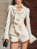 Design: Features elegant ruffle trim along the neckline and front placket, with long sleeves finished by subtle gathered cuffs for graceful movement.