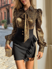 Maeyira presents the Leopard Print Bow Blouse Black Ruffle Skirt Two Piece—a bold ensemble that perfectly balances retro glamour with contemporary edge. The statement leopard print blouse features dramatic puff sleeves and playful bow tie-neck detailing for fierce femininity, beautifully paired with a sleek black high-waisted mini skirt adorned with flirty ruffle accents for striking contrast with confident, fashion-forward appeal.