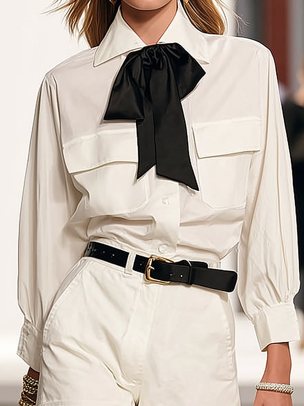 Design: A classic white button-up shirt paired with matching tailored shorts, accented by an elegant neck tie for a minimalist aesthetic.